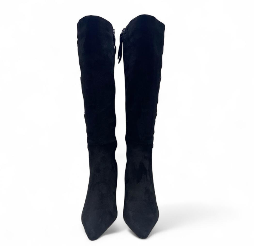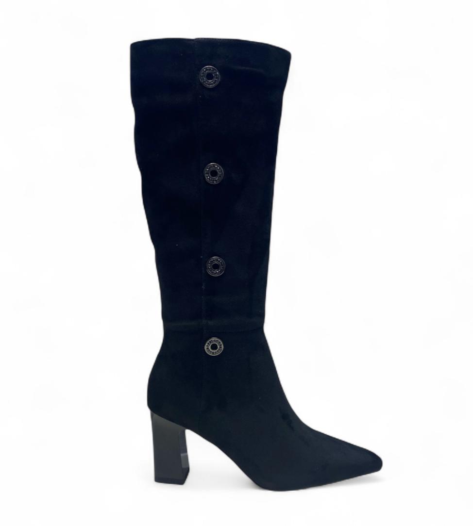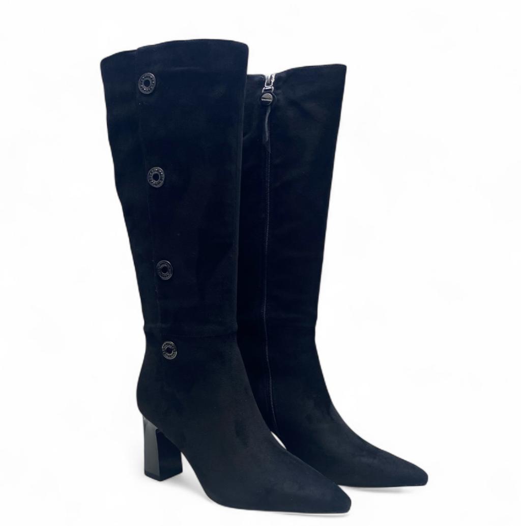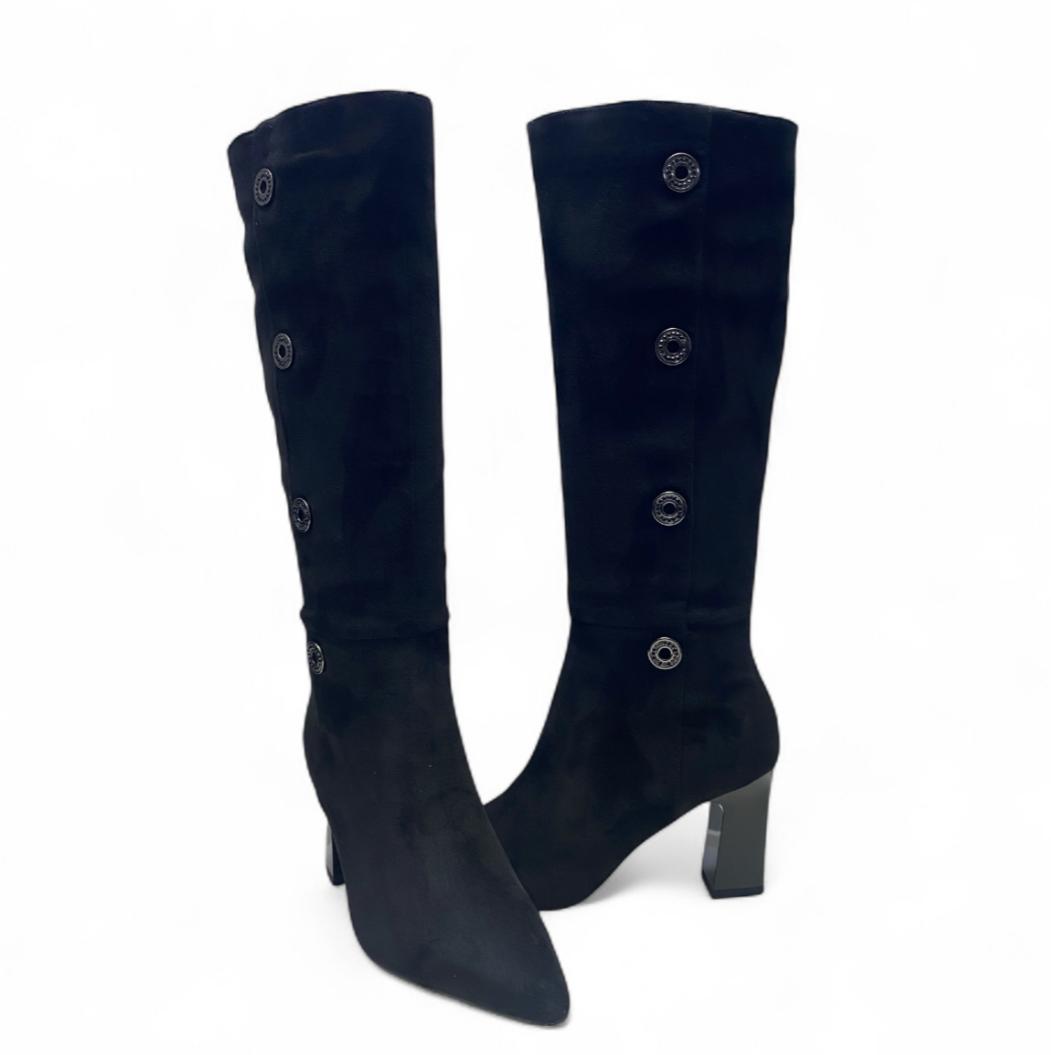 Gli stivali Braccialini uniscono stile e femminilità grazie al design slanciato e ai raffinati bottoni decorativi laterali, che aggiungono un tocco distintivo e glamour. Realizzati in morbido similpelle  scamosciato, avvolgono la gamba con una linea affusolata e seducente, mentre il tacco largo e stabile assicura comfort per tutto il giorno.