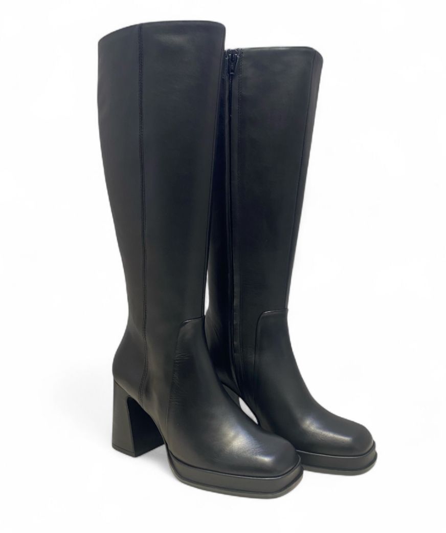 Questo stivale in pelle nera è la perfetta espressione di eleganza contemporanea. Il gambale alto slancia la silhouette, mentre il tacco largo e stabile unito alla platform anteriore garantisce comfort e sicurezza in ogni passo. Realizzato con materiali di alta qualità, è ideale per valorizzare look sofisticati e femminili.