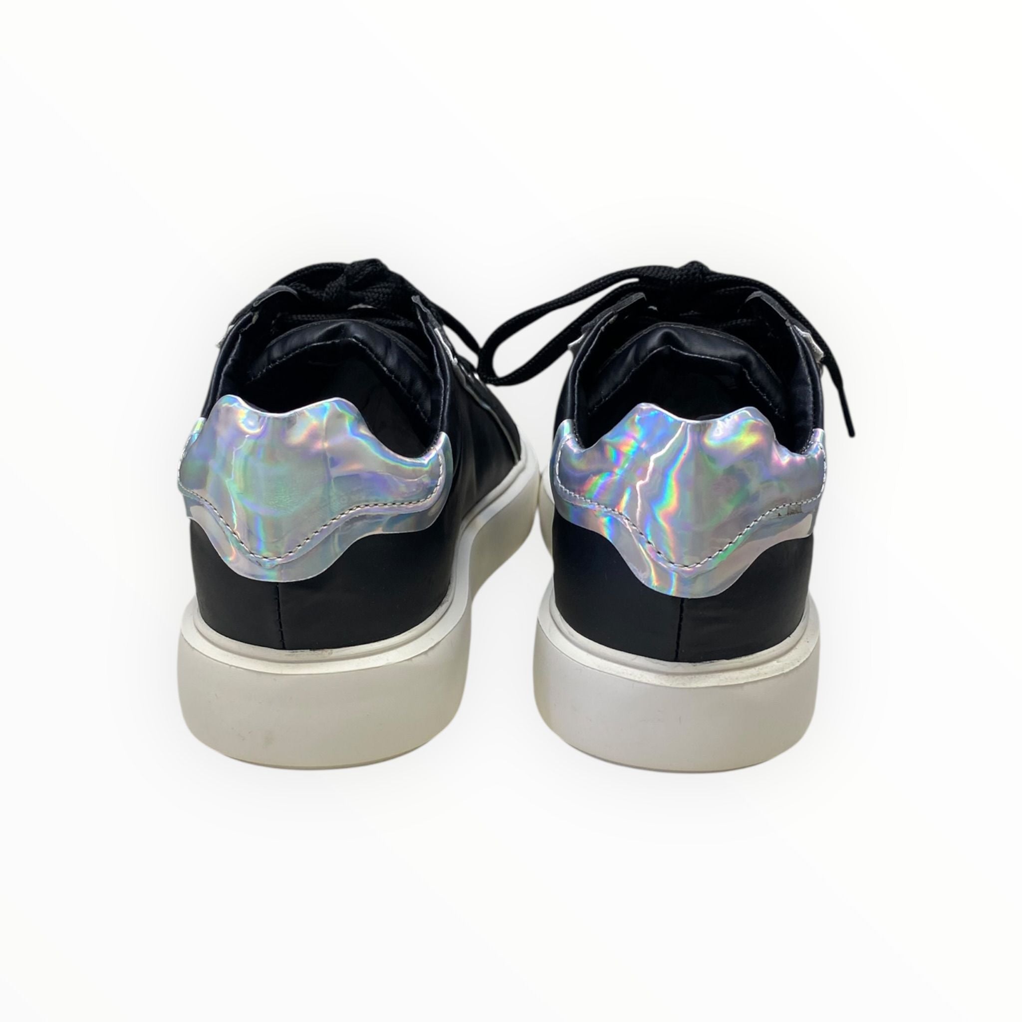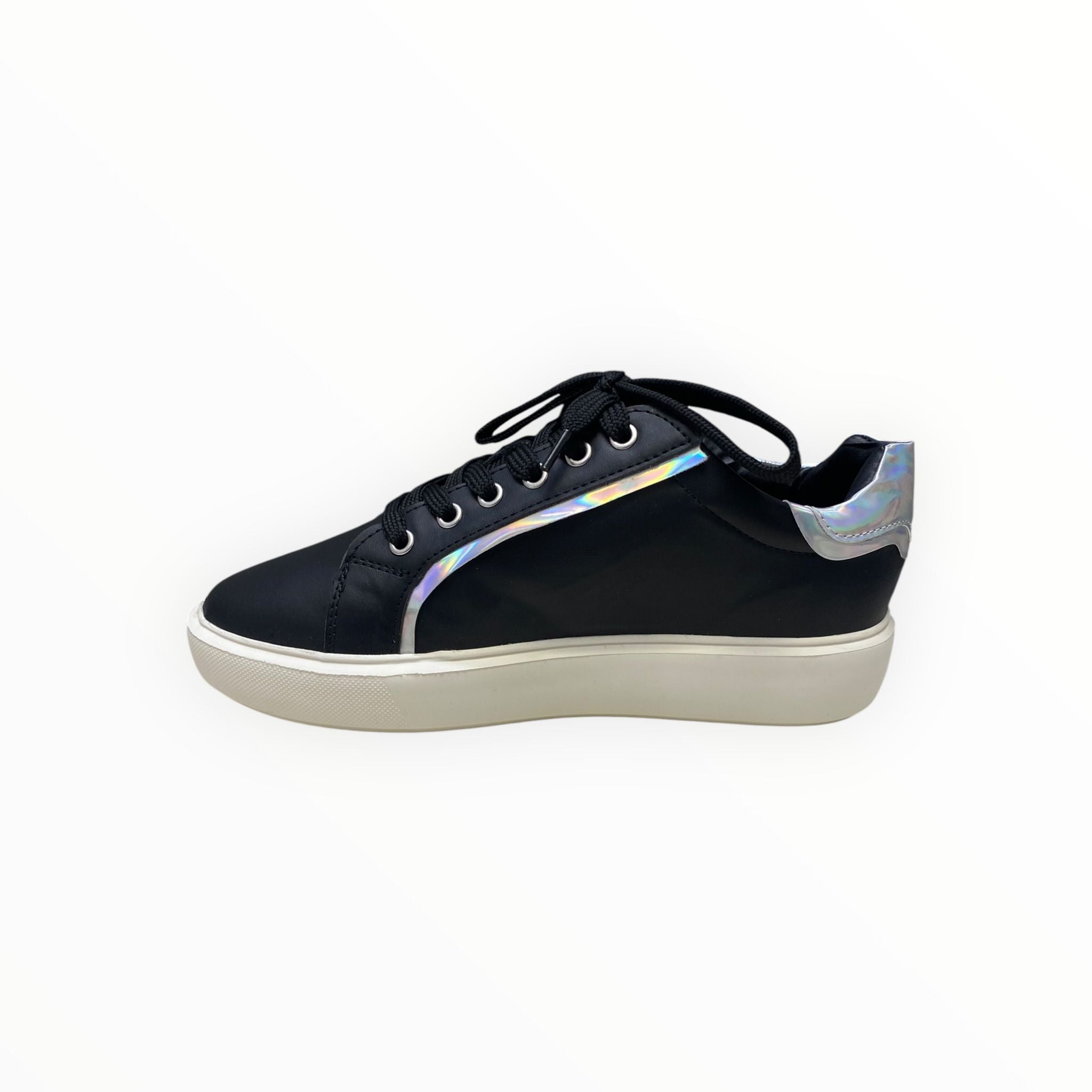 Il contrasto tra il nero elegante e i dettagli riflettenti multicolor rende questo modello perfetto per completare look sia sportivi che casual chic.