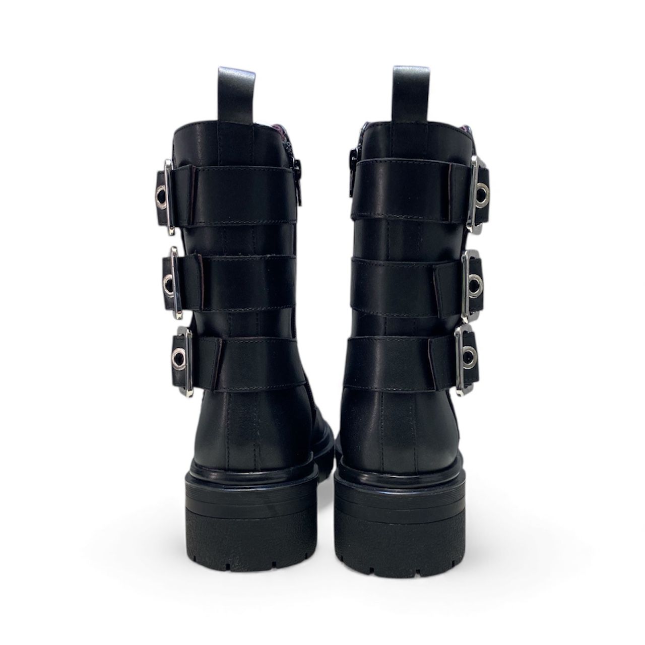 Realizzati in vera pelle nera, si distinguono per le tre fibbie laterali metalliche che donano carattere e personalità, mantenendo uno stile deciso ma sempre raffinato.
