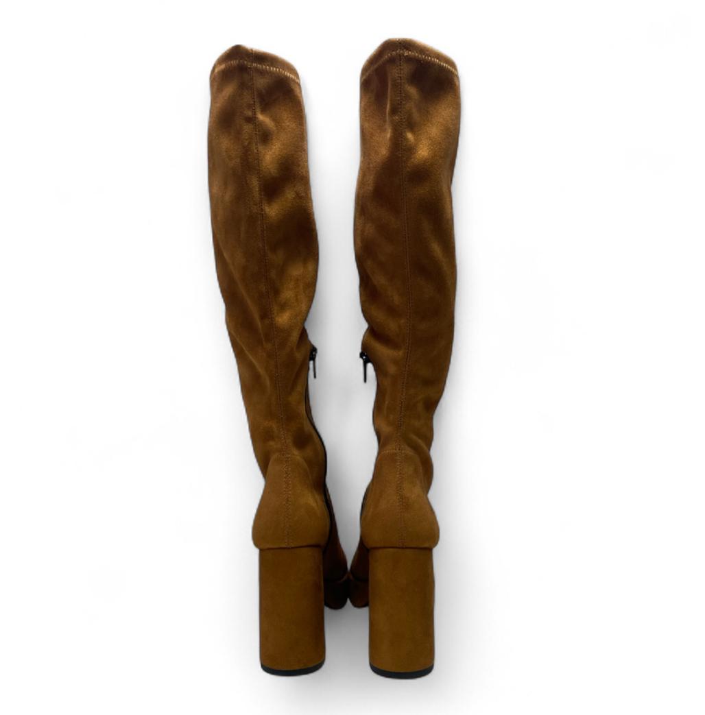 Gli stivali elasticizzati Bruno Premi in similpelle morbido camoscio color cuoio uniscono femminilità e comfort in un design dal fascino anni ’70. La linea affusolata abbraccia la gamba valorizzandone la silhouette, mentre il tacco largo e la platform garantiscono stabilità e slancio, rendendoli perfetti per look sofisticati e di tendenza.